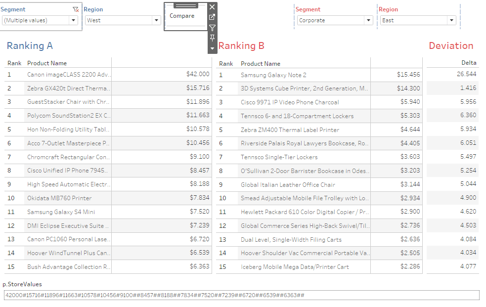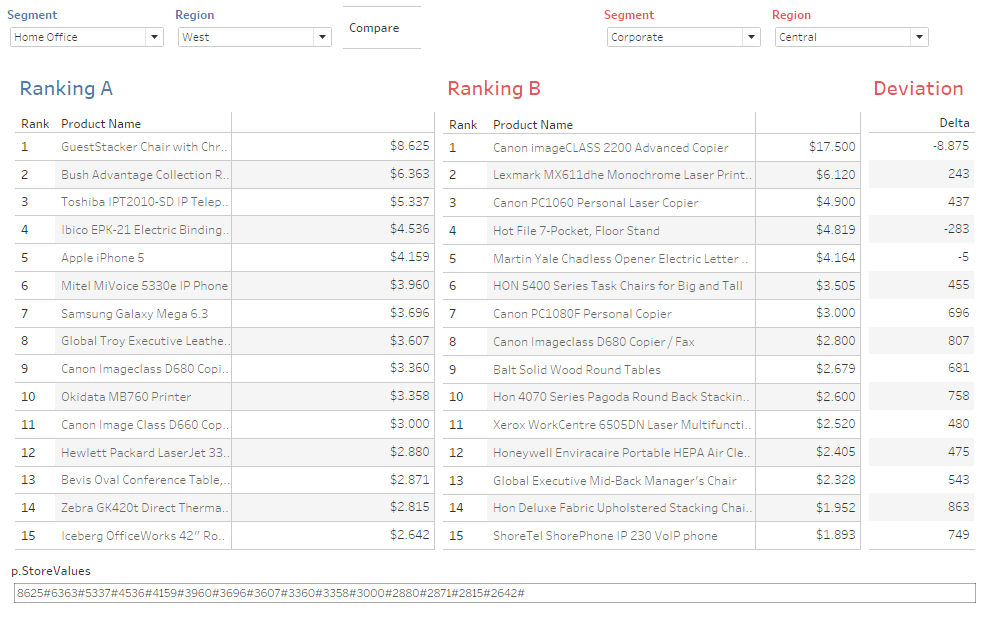 This time, the user wanted to compare two independent rankings. I.e. he did not want to compare on a product level but instead he wanted to compare Rank#1 from Ranking A to Rank#1 from Ranking B etc where both rankings could be based on completely independent filters.