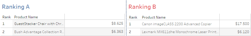 The Top N should be set to be the same for both rankings. If Rank A only has 10 results but B has 13, this will get you in trouble. (as a quick idea, create a parameter that takes the Top N count from A and compare that to Ranking B index(). IF Index() exceeds the parameter, show null. Didn’t test so far).