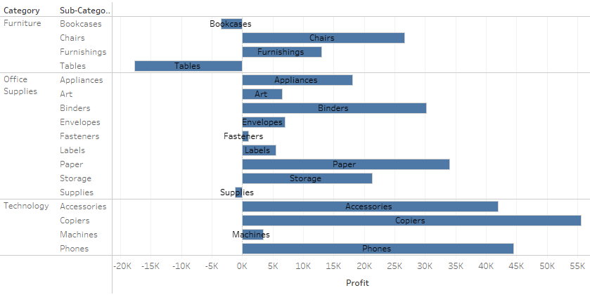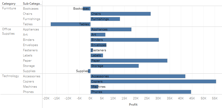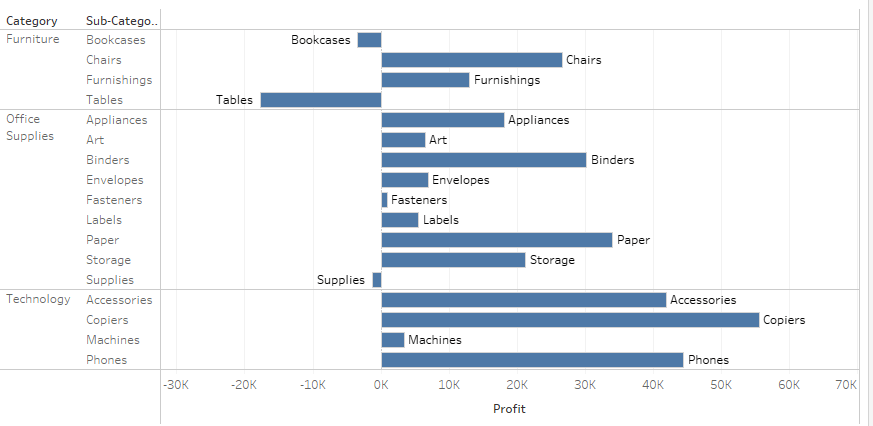 The solution is pretty simple in my case. Create a dual axis with the measure you are using (in the above I used profit) and wrap it in a sign function which we then turn negative