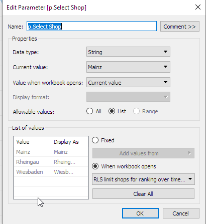 When the user logs in to Tableau Server the RLS User Filter Set will only return his licenses thereby putting a TRUE to all his shops, which then triggers our calculated field which then feeds the parameter we can use to allow the user to select only his shops.