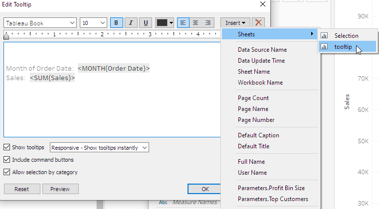 Your intention is that your user can select a customer name from the selection sheet, the graph will adjust to this customer and the tooltip will show this specific customer’s monthly sales by category.