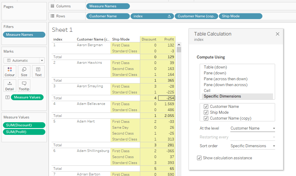 Copy your dimension which you intent to number using the index. In the above example, it is customer name. Put the original customer name to the front and insert your copy behind the index. Right click original customer name and deselect “show header”.