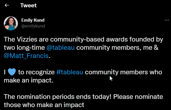 Next week Tableau Conference 2022 is up for an in-person as well as online event. Part of that will be the announcement of the ’22 #data-fam #vizzies awards.