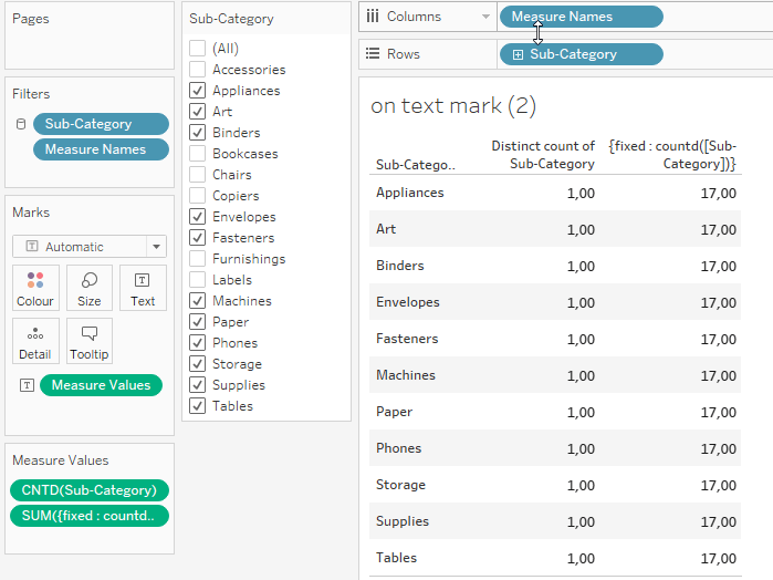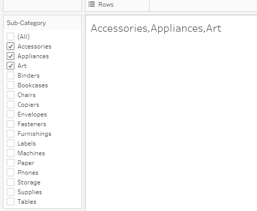 This will give us a concatenated list of all the selected sub-categories. but only on the last mark we will see everything. again, let us have a look using sub-categories on rows: