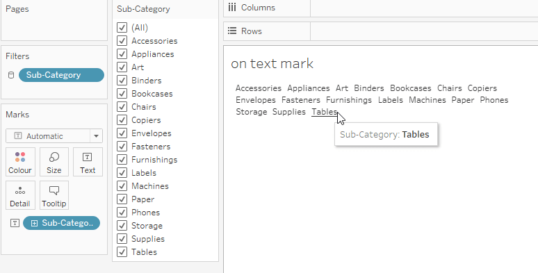 This might seem irrelevant, but really it is not. Because this tells us that Tableau slices everything we do along the Sub-Category. As a reminder: everything on the Columns, Rows, the Pages and the Marks Shelf (here with the exception of tooltips) is considered “in the view” which defines our granularity.
