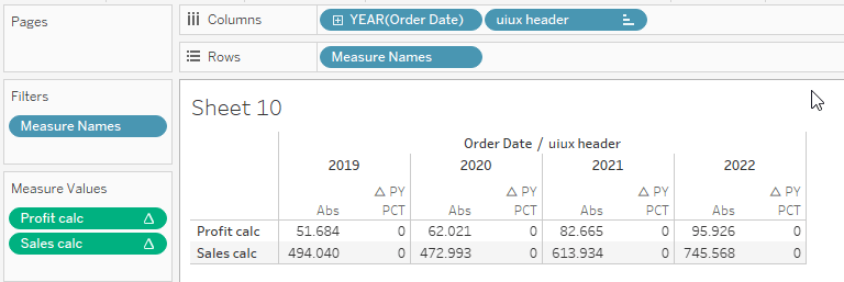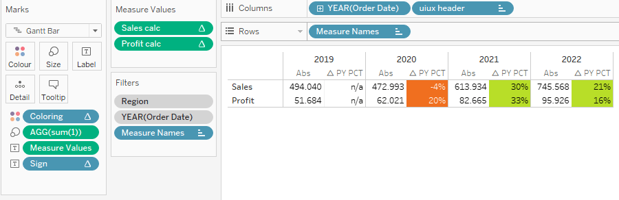 Next on our to-do is to create calculations for sales and profits just as we did in the last blog post. This time, however, they are slightly different. One reason being also that as you can see for fun’s sake we are using the delta in percent year-over-year