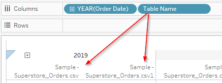Put year([Order Date]) on the columns as well as the new field [Table Name].