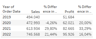 So, right click the two calculations and go to “Edit table calculation”. Untick the “Table Name” and leave Year of Order Date ticked. This will tell Tableau to partition by the table names and do the calculation addressing each year.