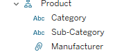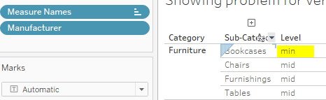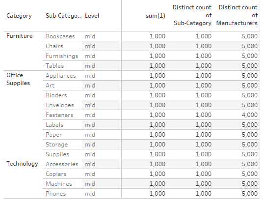 Here, the sum(1) is the same for sub-category and manufacturers but since manufacturers are evaluated first, the level calculation returns to us that we are at the minimum drill down level.
