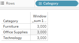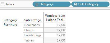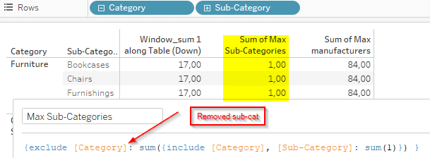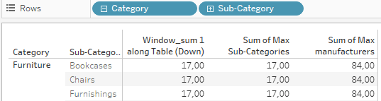 17 rows for the sub-categories and 84 for the manufacturers, even though we are not drilled to theses levels which is why our window_sum returns only 3 for the three categories.