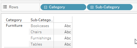 {exclude [Category], [Sub-Category]: sum({include [Category], [Sub-Category]: sum(1)}) }