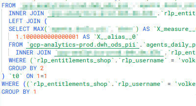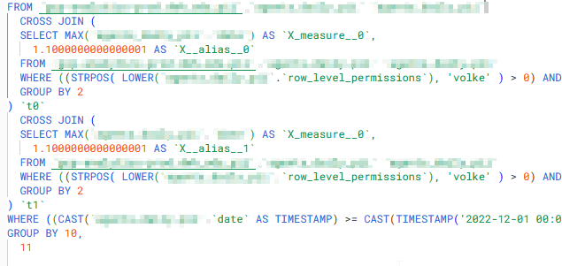 Now, if we add our RLP directly in the data source, using the existing username column we get almost the same query but within the two LOD related cross joins, we see the querying of also the row level permissions.