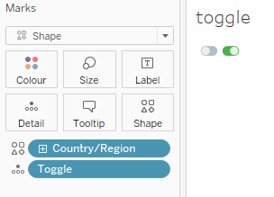 - On the toggle sheet, put [Country/Region] on shapes and assign a shape of your choice to each of the two dimensions.