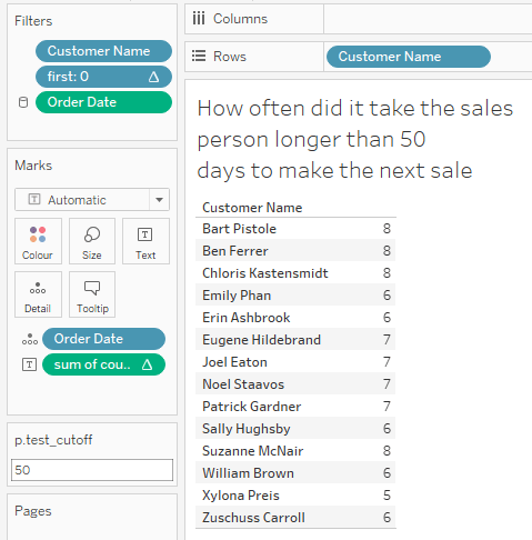Finally, create a “first()” calculation, put it on the filter shelf, edit table calculation, specific dimensions, untick customer name. Then edit filter and only tick the 0 (zero).
