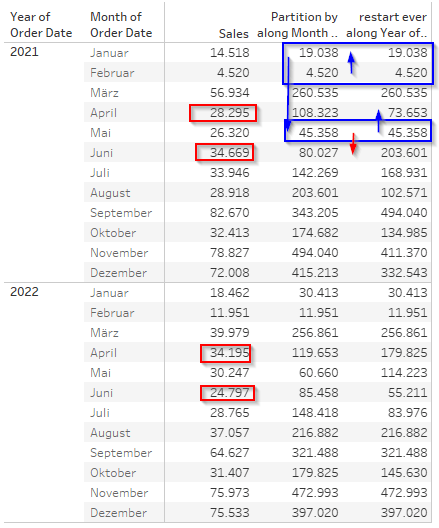 Therefore, within the partition logic sorted by custom sum of sales, June comes prior to April because we do not consider the year. If we consider the year, then in 2021 April value clearly is less then June value and therefore, April is added in our running sum prior to June.