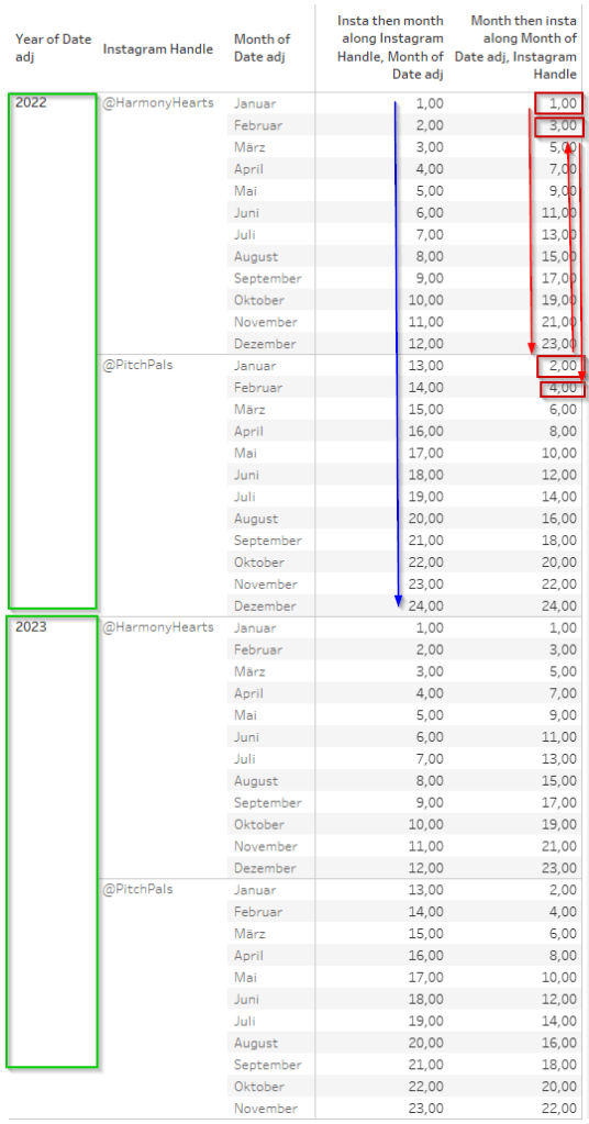 For the red boxes, we can see that it works differently here. Since month is our higher-up addressing field, we first go into the first month, here January and then increment this based on the two instagram handles we have. Only once we are done with this, we now to back to the next month, February, where we continue to increment again for both instagram handles and so on and so forth.