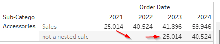 In contrast, a nested calculation is build by creating one calculated field and then the next one where we reference the first calculation within the second.