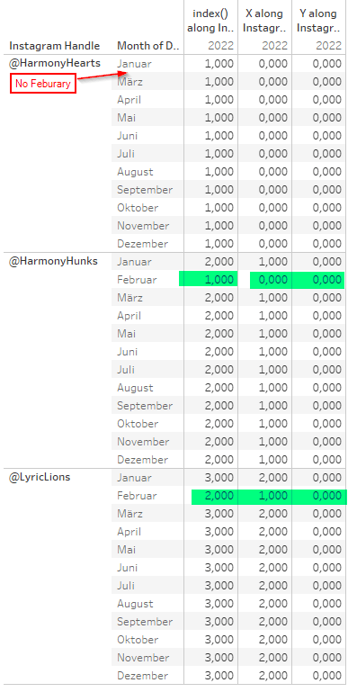 In order to split X and Y into the boxes, we need to calculate the values based on…..? Right, the boyband (here: instagram handles). But there is more to it since we also need to have the months in play and the years as Andy’s challenge included showing a year over year comparison along the months.