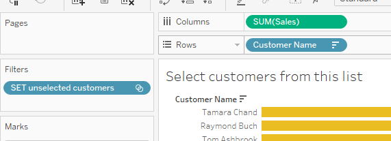 This way, our new set which we will name [SET – selected customers} will be the remainder of all customers less those that we selected. This is mainly for optics and a nicer user flow since we will avoid letting the user click the same customer multiple times for no effect.