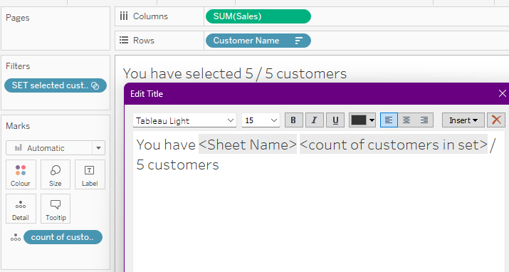 { SUM( {include [Customer Name]: countd(IF [SET selected customers] THEN [Customer Name] END)})}