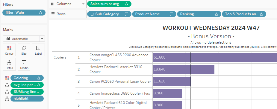 Week 47 by Erica Hughes asked us to provide a solution to a three level challenge. Requiring the option to drill into sub-categories using sets and then show top 5 products with their respective sales compared to the sub-categories’ average for the remaining products.
