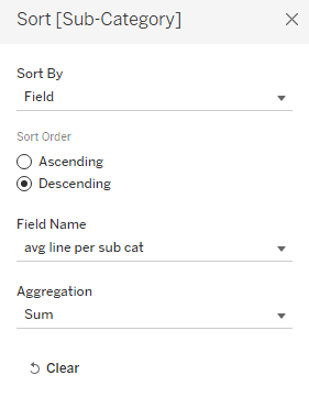 Right click Sub-Category and select “sort”. We want to sort it by the average per sub-category, i.e. the sub-category with the highest average sales should be on top: