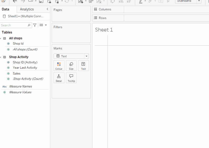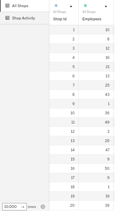 2. Pulling in Shop ID from the Shop Activity table told Tableau to inner join on those two fields. In other words, display only the Shop IDs that are in both tables. For this reason, shops 16-20 disappear from the view because they are not in the Shop Activity table.