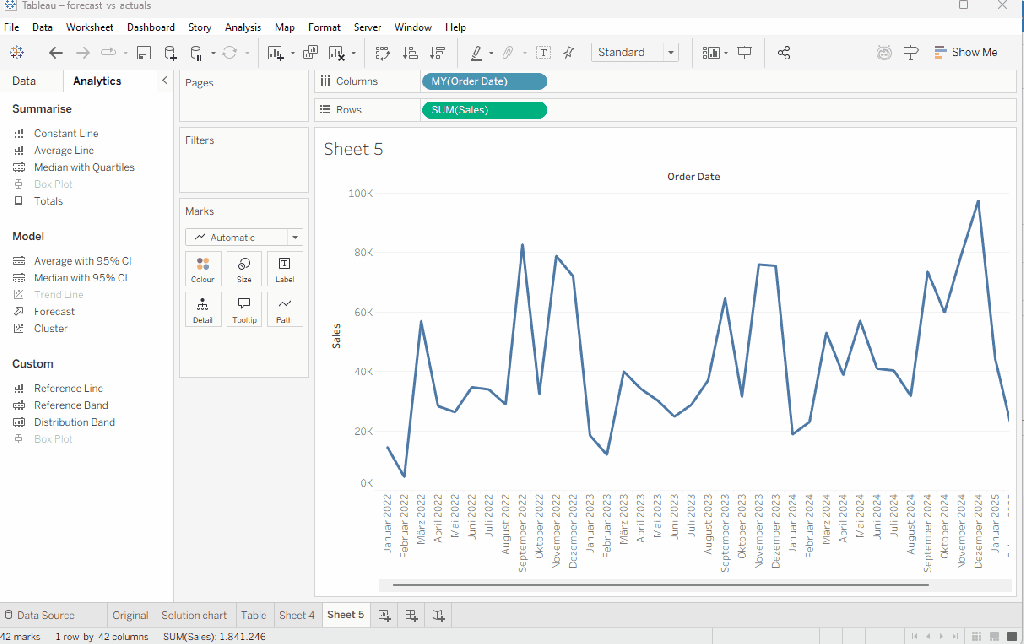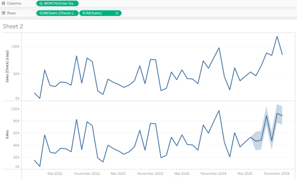 Sticking with above example, we would want to see how our actuals (in this case I am using sample superstore, so we already have the sales values for July to December 2025) compare to the forecast Tableau created based on Jan 2022 to June 2025 data.
