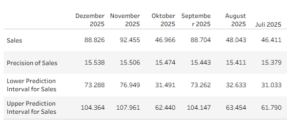 In tablular form, we can set the forecast to provide us with all the information shown in the graph by adding the sales forecast, then right clicking it and checking for example lower or upper prediction result, the precision etc.