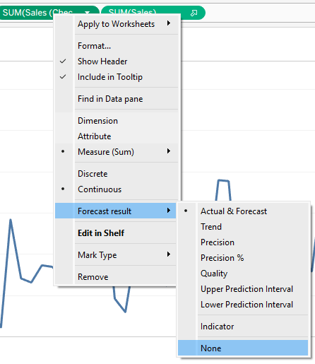 Now, right click on the pill for the sum of sales coming from the checks table and go to forecast result –> none